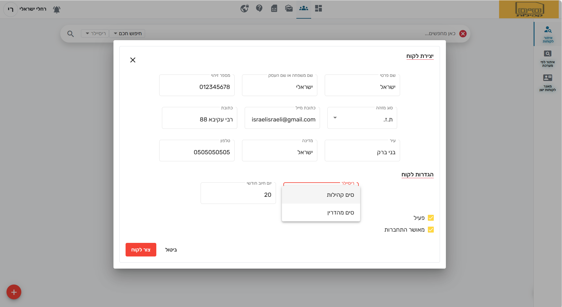 לקוח חדש הקמת כרטיס לקוח כל לקוח חדש שמצטרף ללקוחות החברה מחייב פתיחת כרטיס לקוח במערכת. שימו לב ל 3 פרטים חשובים בהקמת כרטיס לקוח: שיוך לריסיילר שיוך לקהילה אמצעי תשלום שיוך לריסיילר ריסיילר - סים קהילות או סים מהדרין החשיבות בשיוך לריסיילר: תחת כל ריסיילר קיימות קהילות שונות. אם משייכים לקוח לריסיילר שהקהילה שלו לא נמצאת תחת הריסיילר שהוגדר – אין אפשרות לשייך אותו לקהילה הרצויה. שימו לב! אין אפשרות לשנות בהגדרות הלקוח את הריסיילר שעליו הוא הוקם וכן אין אפשרות למחוק את כרטיס הלקוח שנוצר. לכן חשוב לבדוק את הריסיילר לפני הקמת הלקוח. מומלץ בתחילת השיחה לוודא עם הלקוח האם הוא חלק ממוסד שמחייב סים של החברה או לקוח פרטי. לקוח פרטי - משייכים לריסיילר בהתאם למספר שאליו הוא חייג. לקוח של קהילה – יש להיכנס ב CRM ללשונית קהילות ובשדה החיפוש לחפש את שם הקהילה שאליה הוא משתייך, מתחת לעמודה ריסיילר מצוין להיכן משתייכת קהילה זו. ישיבות חב"ד - משויכות כולן תחת סים קהילות. שיוך לקהילה חשוב וקריטי לשייך לקוח לקהילה מיד בסיום יצירת הכרטיס, אם לקוח לא משויך לקהילה אין לו אף חסימה על הסים. קהילות: לקוח פרטי קהילות –ללא צינתוקים נייח. לקוח פרטי מהדרין – ועד בני תורה – ללא צינתוקים נייח. לקוח של מוסד – שיוך לפי שם הישיבה (למשל - מאור מנחם חב"ד, מאור התלמוד וכו') אמצעי תשלום לאחר הקמת כרטיס לקוח ושיוך לקהילה יש להכניס פרטי אשראי. אופן התשלום היחידי בחברה הוא באמצעות כרטיס אשראי. אין אפשרות לשלם בהוראת קבע בנקאית או בהעברה בנקאית, גם לא באופן חד פעמי. כל סוגי האשראי מתקבלים מלבד אשראי DINERS. יש לוודא עם הלקוח מראש שהאשראי שלו הוא לא DINERS, התשלום באשראי זה לא עובר. אופן הקמת כרטיס לקוח יש להיכנס ללשונית לקוחות בצד שמאל למטה ללחוץ על + נפתח חלון שבו יש להכניס את פרטי הלקוח כמפורט: שם לקוח שם הלקוח שמעודכן בכרטיס לקוח הוא שם הלקוח שעליו נרשמות החשבוניות, לכן מומלץ לבקש מהלקוח פרטי לקוח של המשלם. אמצעי זיהוי חובה להכניס אמצעי זיהוי תקין. אם ללקוח אין ת"ז ניתן להזין מספר דרכון, רק מספר ללא אותיות ובשדה 'סוג מזהה' לשנות ל- דרכון. מייל חובה לכתוב כתובת מייל – לציין ללקוח שלשם מגיעות הקבלות והעידכונים. אין אפשרות לקבל קבלות לדואר. במקרה שאין ללקוח מייל יש להכניס את המייל nergershon@gmail.com טלפון יש להכניס מספר ליצירת קשר, רצוי מספר שונה ממספר המנוי. יום חיוב יש לעדכן את כל הלקוחות על ה 20 לחודש. [image: 1765401566379.png] לאחר מילוי הפרטים יש ללחוץ על 'צור לקוח'. הערה: במקרה שאחד מהפרטים של הלקוח כבר קיים בכרטיס לקוח אחר בחברה תופיע על המסך ההערה: לקוח קיים עם מזהה לקוח X [image: 1765401909821.png] במקרה זה יש להיכנס לכרטיס הקיים ולבדוק את הקהילה אליה הלקוח משויך אם הלקוח רוצה להוסיף מנוי שישויך לקהילה אחרת - יש ללחוץ על אישור ולהמשיך בתהליך הקמת המנוי כרגיל. אם אין הבדל בין הקהילות - אין ליצור כרטיס לקוח חדש אלא להמשיך את התהליך בכרטיס הקיים. מיד כשכרטיס הלקוח נוצר תראו בחלק העליון 2 הערות: שים לב! הלקוח לא משויך לקהילה! שים לב! ללקוח אין אמצעי תשלום פעיל! [image: 1765923099147-d20cf919-14eb-4673-81e9-5016ee1eb7e6-image.png] ראשית יש לשייך את הלקוח לקהילה: יש ללחוץ על 'שיוך לקהילה'. [image: 1765923290543-c99bc229-8a6b-4efe-a854-6eec17bf2523-image.png] יש לחפש את שם הקהילה אליה משויך הלקוח. [image: 1765923327873-20d13560-3442-4fa9-86d2-2f17d04346f6-image.png] הסבר על קהילות ניתן למצוא בקטגוריה קהילות. לאחר שיוך הלקוח לקהילה יש לעדכן אמצעי תשלום: יש ללחוץ על 'הוספת אמצעי תשלום' ולהכניס את פרטי האשראי. [image: 1765923510960-b245df2a-712c-402c-86be-32bf836da153-image.png] [image: 1765923582520-6785a070-5ccf-440d-bd60-2c5706097b24-image.png] לאחר שסיימנו להכניס את פרטי הלקוח, לשייך אותו לקהילה ולעדכן פרטי אשראי הלקוח כבר קיים במערכת ונוכל לתת לו שירות.